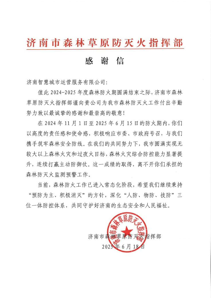 近日,济南市森林草原防灭火指挥部向济南智慧城市运营服务有限公司发来感谢信,对智慧城市公司在2024-2025年度森林防火期工作中的突出表现给予高度肯定。
