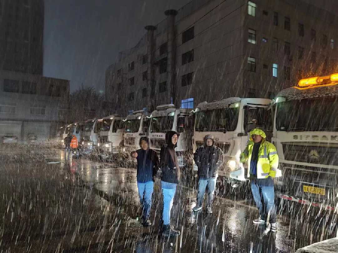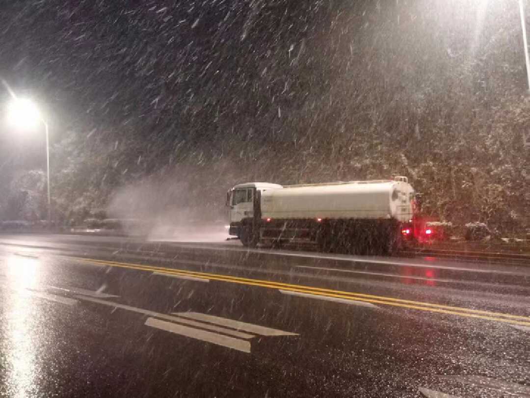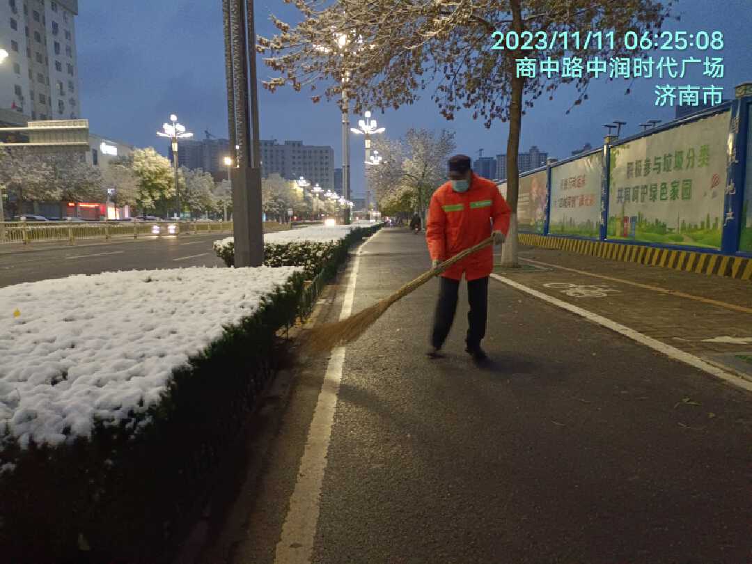 11月10日晚10点,雪花如约而至,按照《济南市清雪除冰工作预案》,清雪队伍立刻出动,对全市主次干道进行清扫保洁,撒布机、滚扫机、水车等清雪设备车辆一齐出动,最大限度减少路面结冰。
