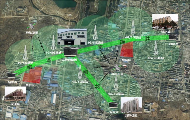 示范中心基于平阴县物流快递需求和地面配送网点建设现状,综合考虑低空空域环境、无人机起降性能、5G/4G通信导航设施性能与市政安全防护要求等影响要素,建设物流无人机起降场,规划设计低空无人机物流运输航线和飞行规则,开展全县范围内低空物流商业化运营、维护保障和完善升级等服务,打造“低空公共运输+地面共同配送+城乡双向融合”的现代物流体系。