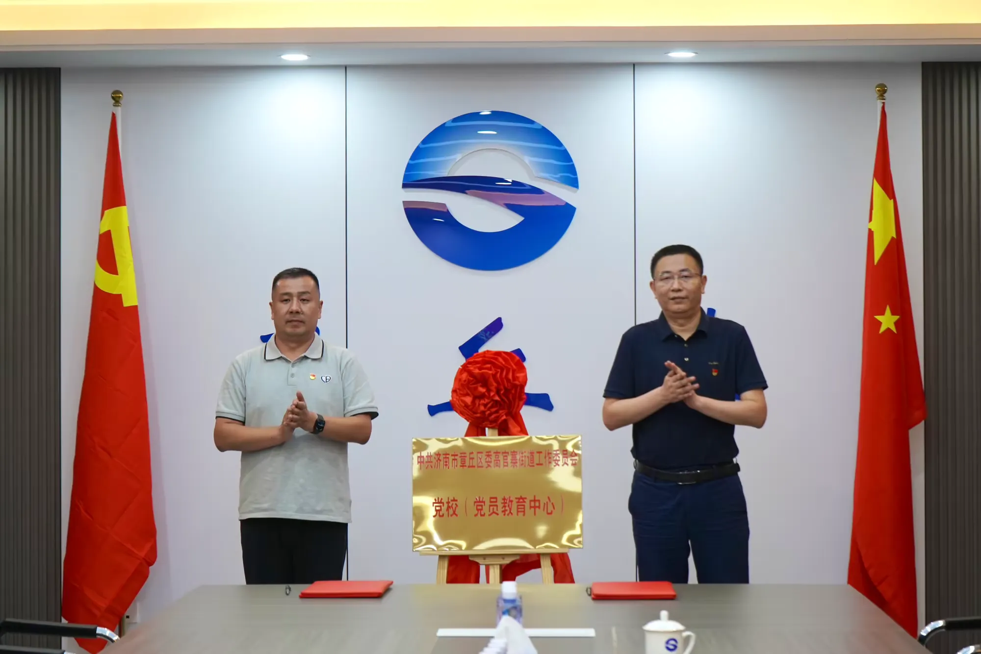 马永、张盟为中共济南市章丘区委高官寨街道工作委员会党校(党员教育中心)揭牌。